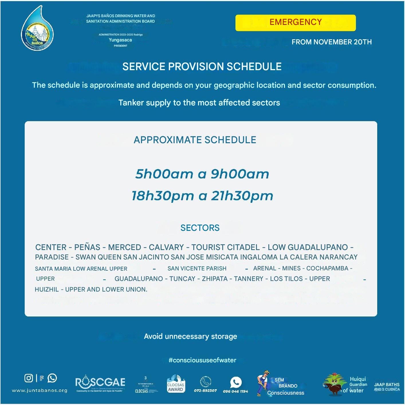 The Junta de Agua Potable de Baños will start water rationing on November 20, 2024. When you live in Baños proper or other areas served by this water company (for example Narancay and Control Sur) you won’t have water from approximately 5 am to 9 am and from approximately 6:30 pm to 9:30 pm.